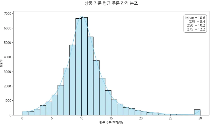 - 가설 : 특정 상품은 소비자들이 규칙적인 간격으로 반복 구매하는 경향이 있다. 이러한 상품은 정기 구독, 재고 리마인더, 맞춤형 프로모션 타겟으로 활용 가능하다.