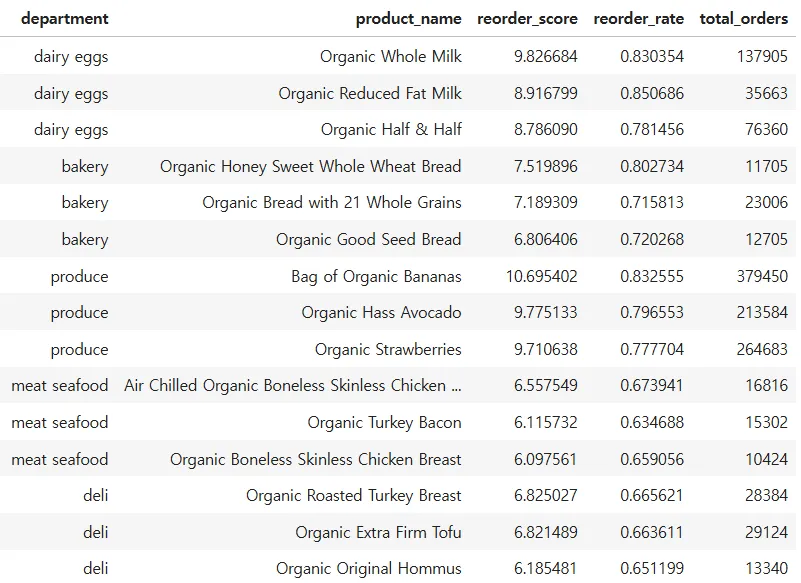 - 유기농 제품 전체 중에서 각 department의 평균 reorder_score 계산하여 Top 5 부서 선정 → 각 상위 부서에서 reorder_score가 높은 유기농 제품을 3개씩 추출