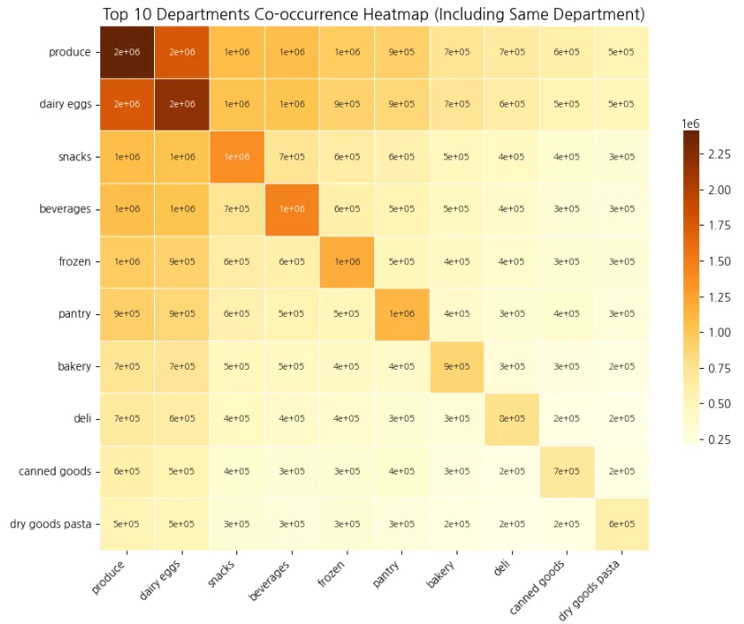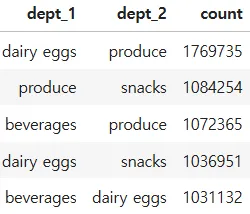 - 부서쌍 기반 접근 효과 : dairy eggs, beverages, snacks 등 다양한 부서 등장