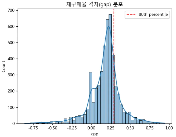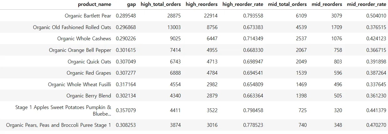 - gap = 고충성 고객 reorder_rate - 중충성 고객 reorder_rate → gap이 크다는 것은 고충성 고객에게는 잘 팔리는 제품인데 중충성 고객은 아직 소비를 잘 안 한 제품이라는 뜻