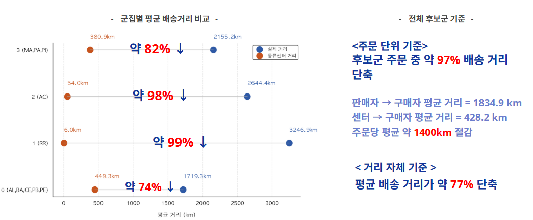 - 주문 단위: 판매자 → 구매자 평균 거리 1834.9km에서 센터 → 구매자 평균 거리 428.2km로, 주문당 약 1400km 절감