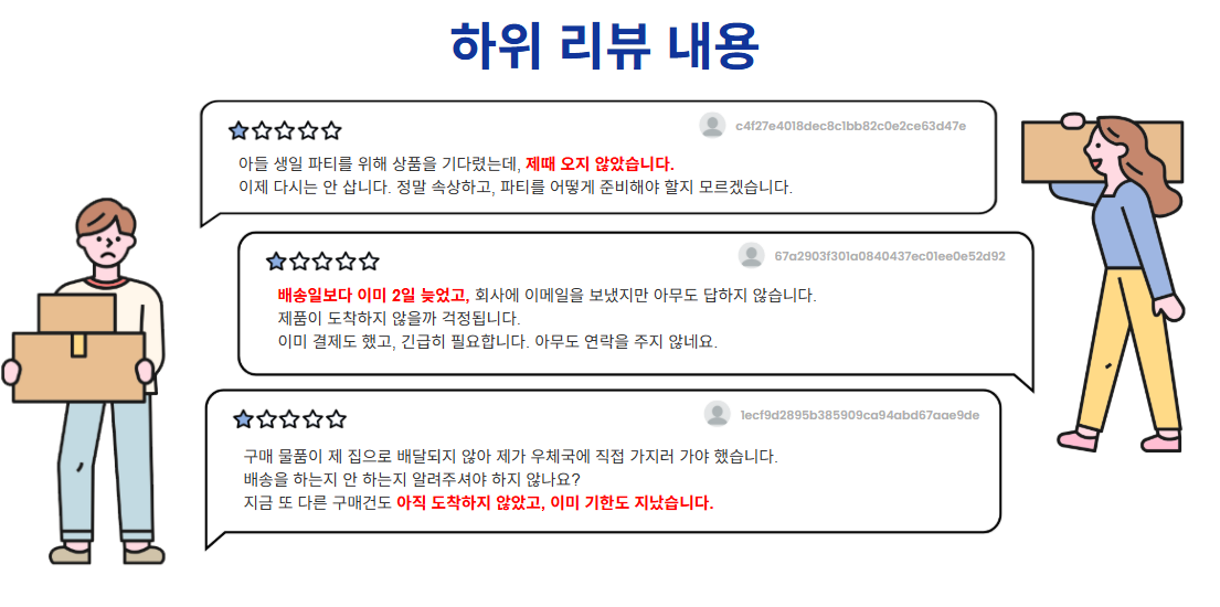- 정기/조기배송 낮은 리뷰에 대한 원인으로 배송 외의 것들은 고려하지 않았는지
