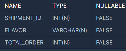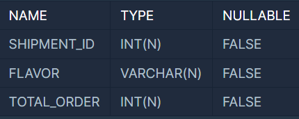 JULY 테이블 구조는 다음과 같으며, SHIPMENT_ID, FLAVOR, TOTAL_ORDER 은 각각 아이스크림 공장에서 아이스크림 가게까지의 출하 번호, 아이스크림 맛, 7월 아이스크림 총주문량을 나타냅니다. JULY 테이블의 기본 키는 SHIPMENT_ID입니다. JULY테이블의 FLAVOR는 FIRST_HALF 테이블의 FLAVOR의 외래 키입니다. 7월에는 아이스크림 주문량이 많아 같은 아이스크림에 대하여 서로 다른 두 공장에서 아이스크림 가게로 출하를 진행하는 경우가 있습니다. 이 경우 같은 맛의 아이스크림이라도 다른 출하 번호를 갖게 됩니다.